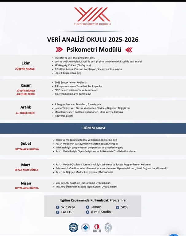 Eğitim Fakültesi öğretim üyelerinden Doç. Dr. Beyza AKSU DÜNYA, Yükseköğretim Kurulu (YÖK) himayesinde hayata geçirilen “Veri Analiz Okulu”nda eğitmen olarak yer alacak. Veri Analiz Okulu; Marmara Üniversitesi Nüfus ve Sosyal Araştırmalar Enstitüsü koordinasyonunda ODTÜ, İTÜ ve Boğaziçi Üniversitesinin katkılarıyla düzenlenecek. Okulun psikometri modülünde görev alacak Doç. Dr. Beyza AKSU DÜNYA, “Klasik ve modern test teorisi ve Rasch modellerine giriş”, “Rasch modelinin varsayımları ve matematiksel altyapısı”, “IRT/Rasch için yaygın yazılım programları ve paketlerine giriş”, “Rasch modelleriyle ölçek geliştirme ve psikometrik özelliklerini inceleme”, “Rasch modeli çıktılarını yorumlamak için Winsteps ve Facets Programlarının kullanımı”, “Psikometrik özelliklerin incelenmesi ve yorumlanması: Uyum indeksleri, yerel bağımsızlık, güvenirlik”, “Rasch ile değişen madde fonksiyonu analizi”, “Çok boyutlu Rasch ve test eşitleme uygulamaları” ve “IRTShiny üzerinden madde tepki kuramı uygulamaları” konu başlıklarında eğitimler verecek.