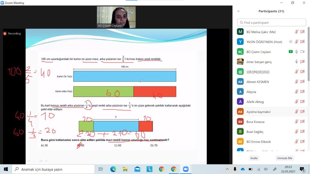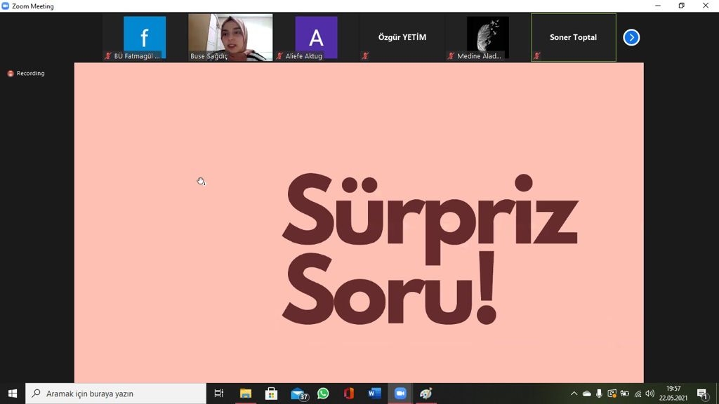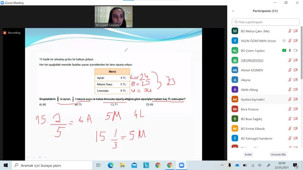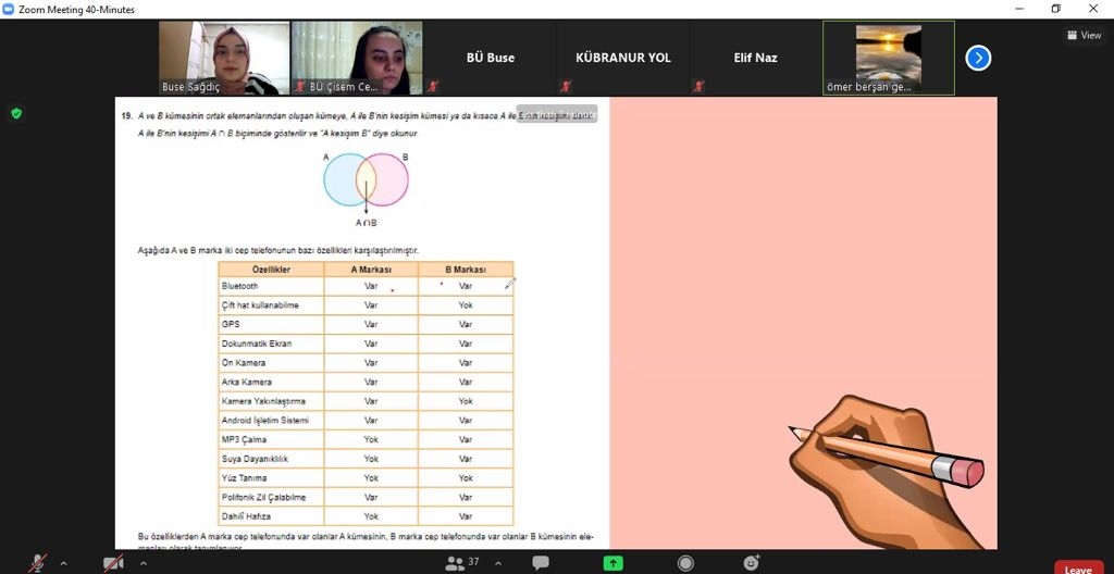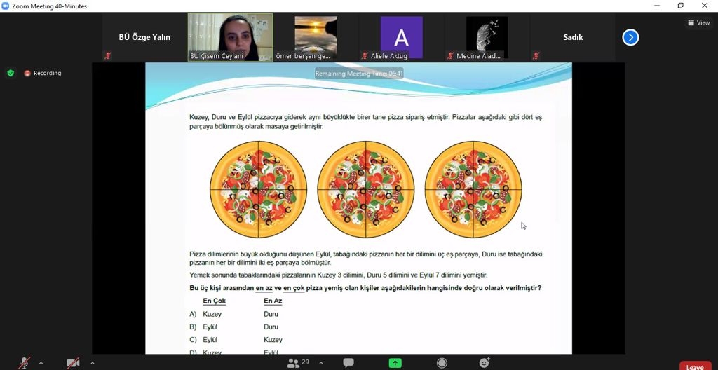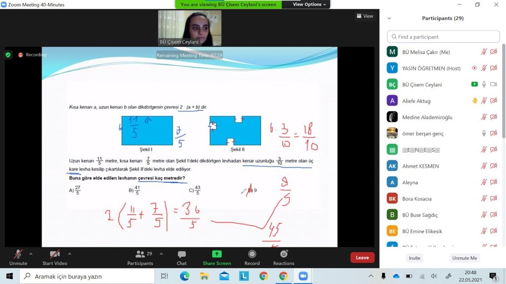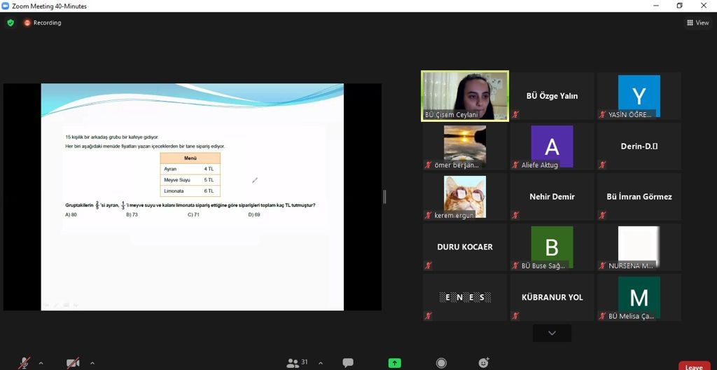 Saat 19.30’da başlayan etkinliğin ilk oturumunda öğretmen adayı Buse Sağdıç, “Doğal Sayılar” ünitesi ile ilgili yeni nesil soruların çözümünü, saat 20.15’te başlayan ikinci oturumda ise öğretmen adayı Çisem Ceylani, “Tam Sayılar” ünitesi ile ilgili yeni nesil soruların çözümünü  eğlenceli sunumlarıyla ortaokul öğrencilerine aktardılar. Bu sayede birlikte sonuca ulaşmanın keyfine vararak öğrencilerin ders dışı etkinliklerle de matematik sorularıyla uğraşmalarını sağladılar. Aynı zamanda öğrencilerin yeni nesil sorulara karşı ön yargılarını kırmak için adım atılmış oldu.
